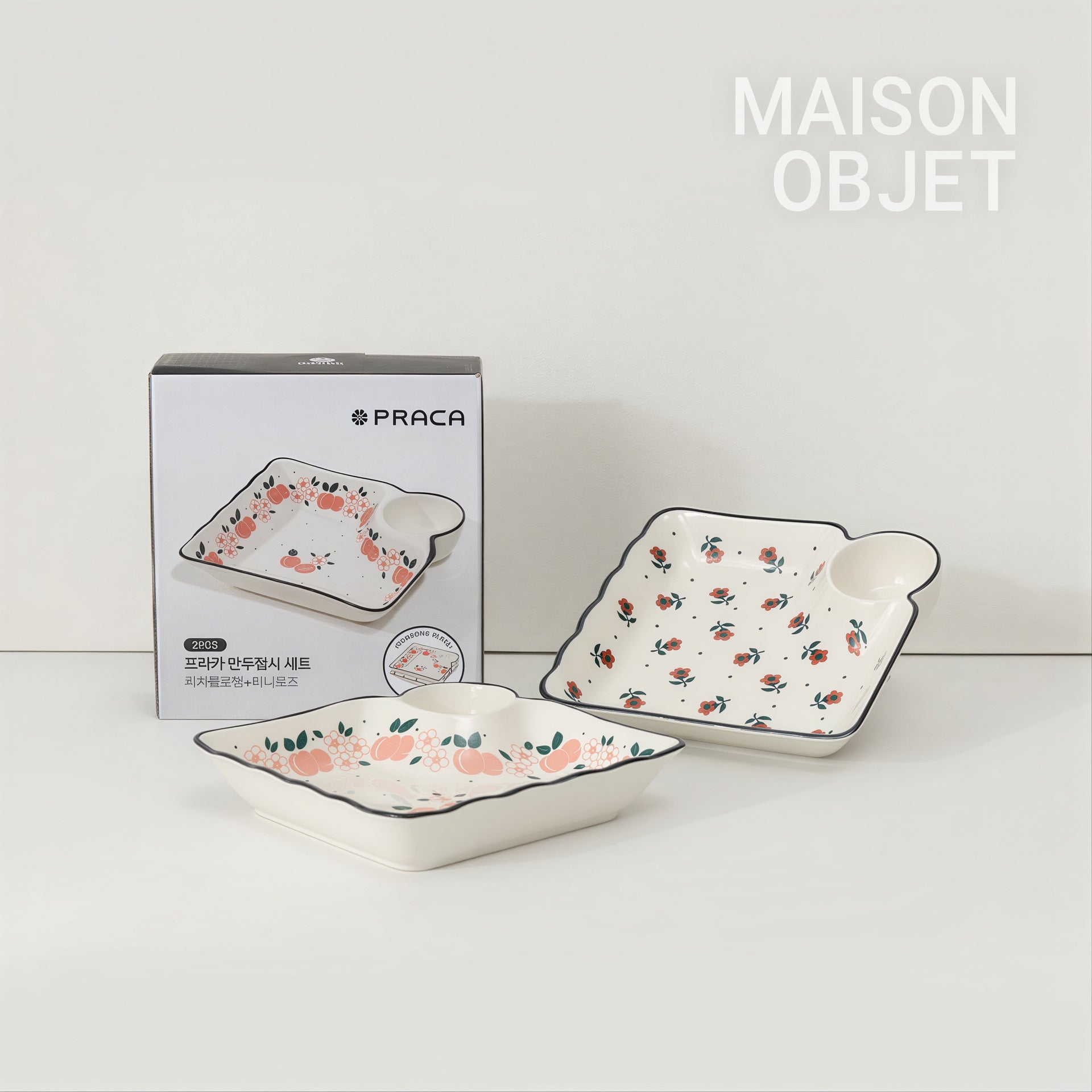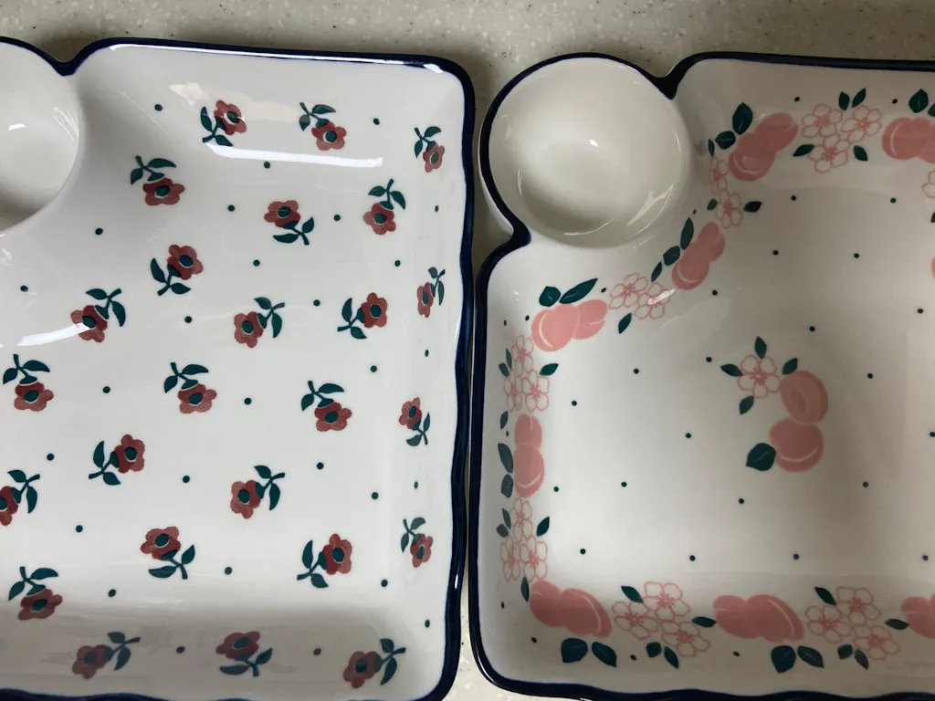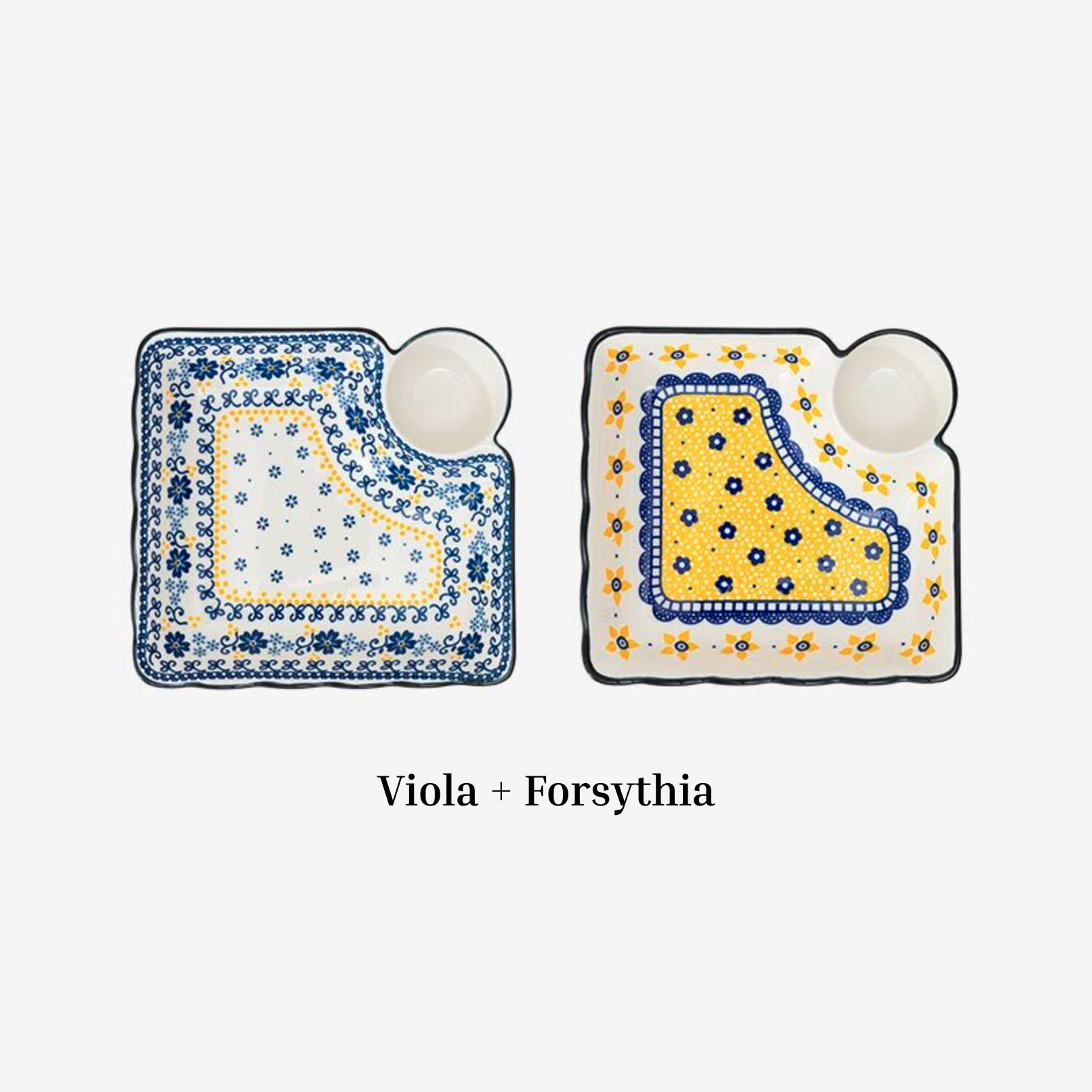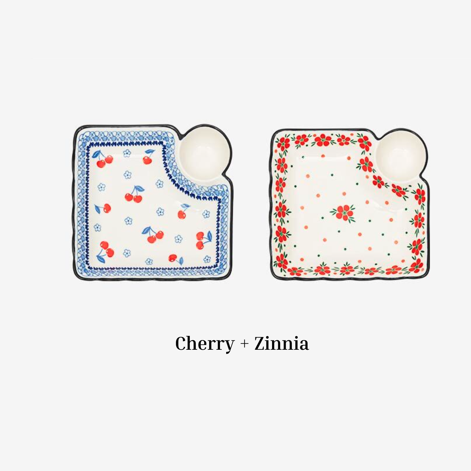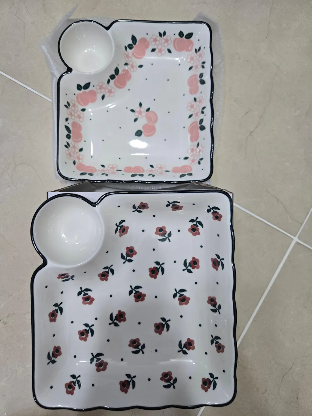 A floral square ceramic plate with a built-in sauce compartment that keeps dipping sauce separate without needing an extra dish. The divided layout is practical for everyday plating, and the patterned surface with a handmade cobalt-blue edge adds a decorative detail that makes the set stand out. Comes as a 2-piece set. Home oven, microwave, and dishwasher safe.