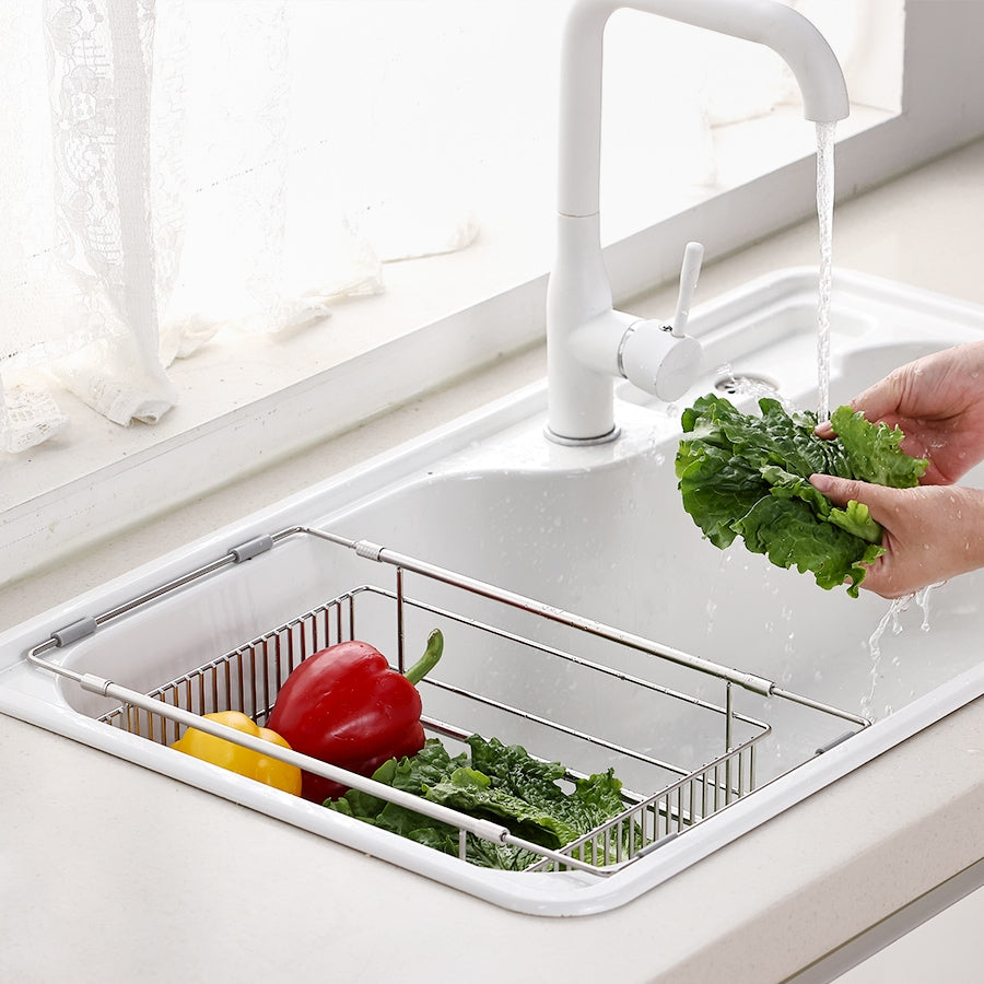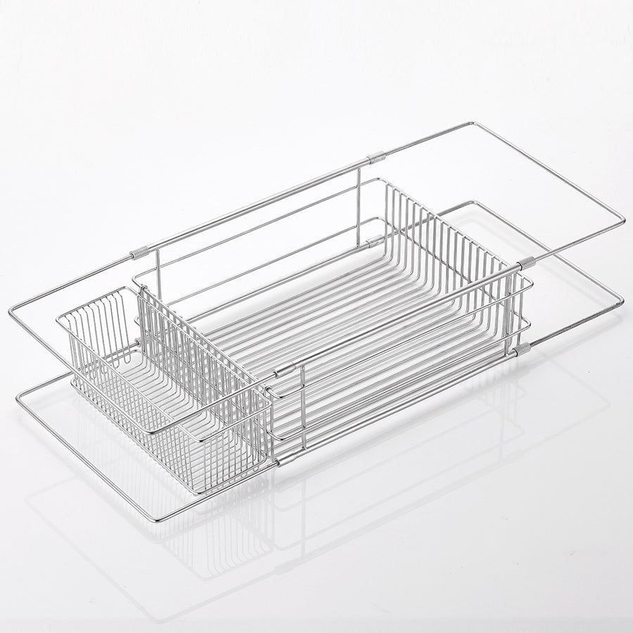 This adjustable stainless steel dish drying rack sits directly over or inside your sink, helping you make the most of limited kitchen space. The flexible slide bar stretches from 13" to 23.6" to fit most sink sizes, while the dual up-and-down placement lets you position it inside or above the sink depending on your setup.