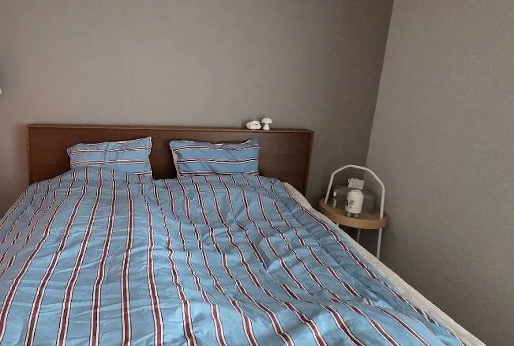 A minimal stripe pattern inspired by mid-century vintage design adds visual depth while preserving a calm and modern bedroom look. -