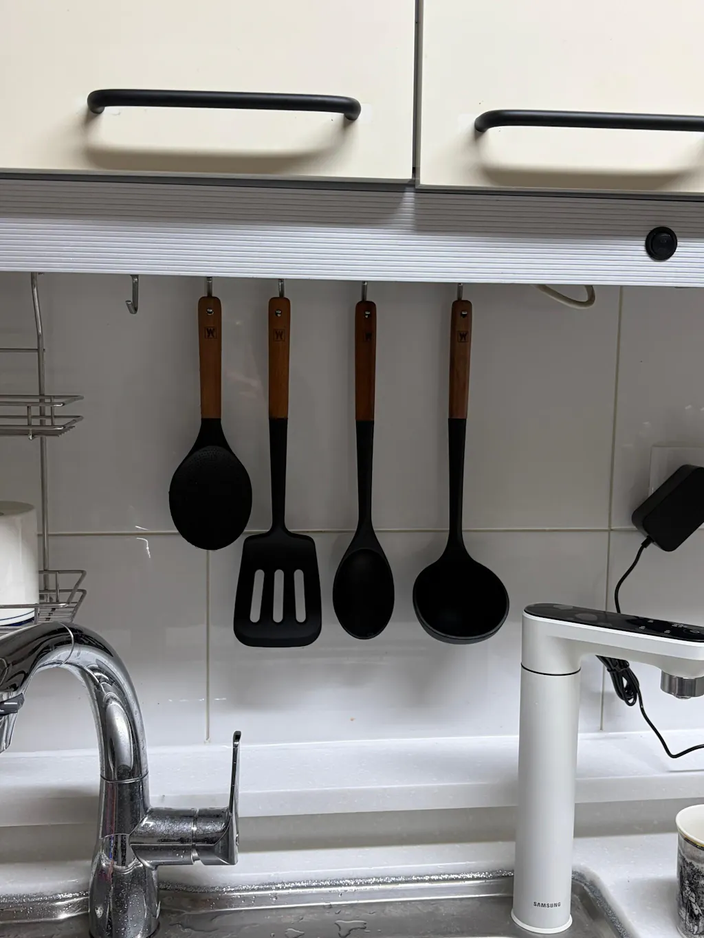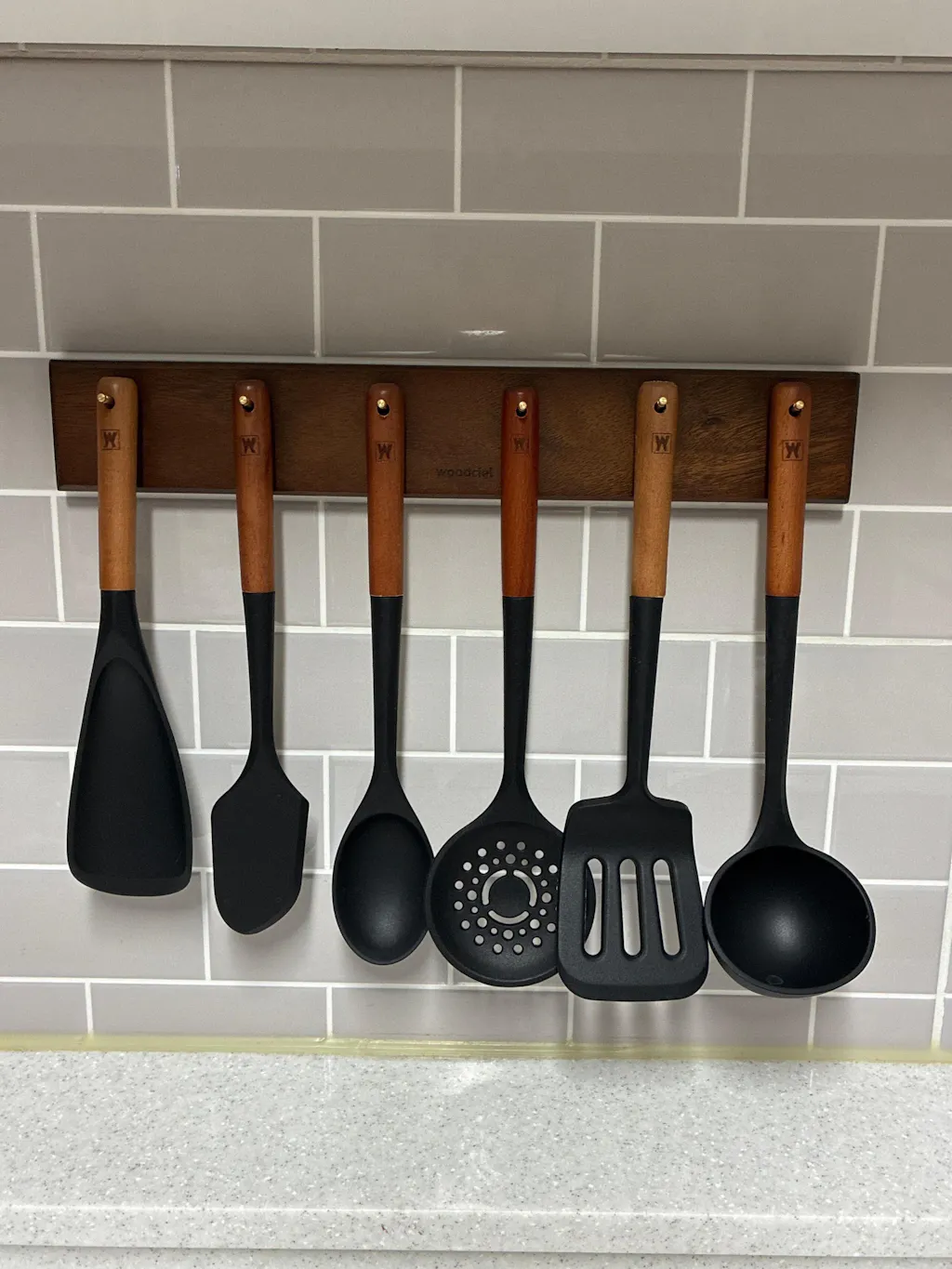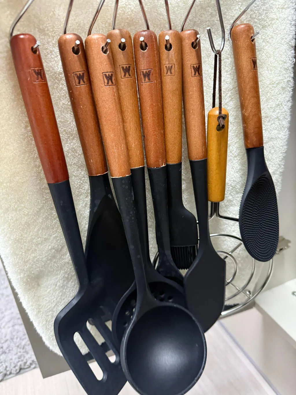 This is a well-known and stylish set with a lot of useful pieces. I like the variety, but the handle holes are a bit small, so it's hard to find a holder that fits. I ended up hanging them with string.