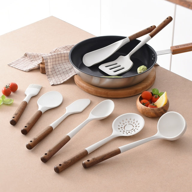 - 8-Piece Versatile Set — Includes a turner, ladle, stir-fry spoon, skimmer, multi spoon, spatula, basting brush, and rice paddle.