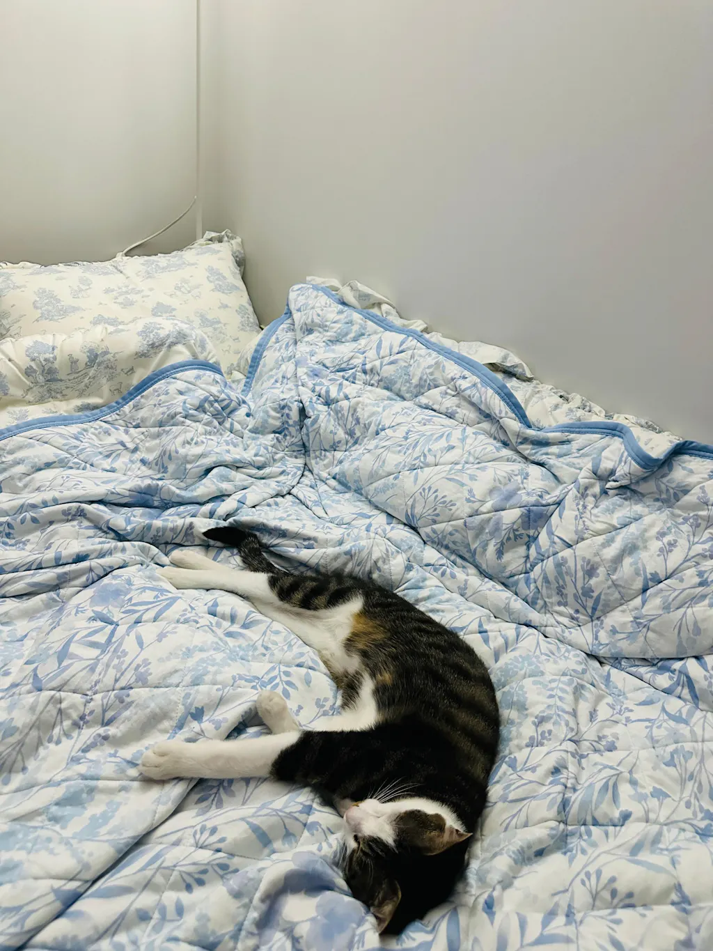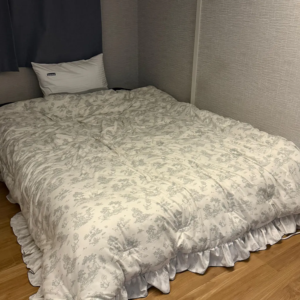 The peach skin description had me worried it would be too fuzzy, but it's not! It's more of a nice blend of soft and that hotel-style crisp feel. I personally wished the frill had a deeper blue trim, but honestly the simpler edge is better while you're sleeping. If you want a cool-toned, all-season comforter with a relaxed hotel vibe, this is a solid pick.