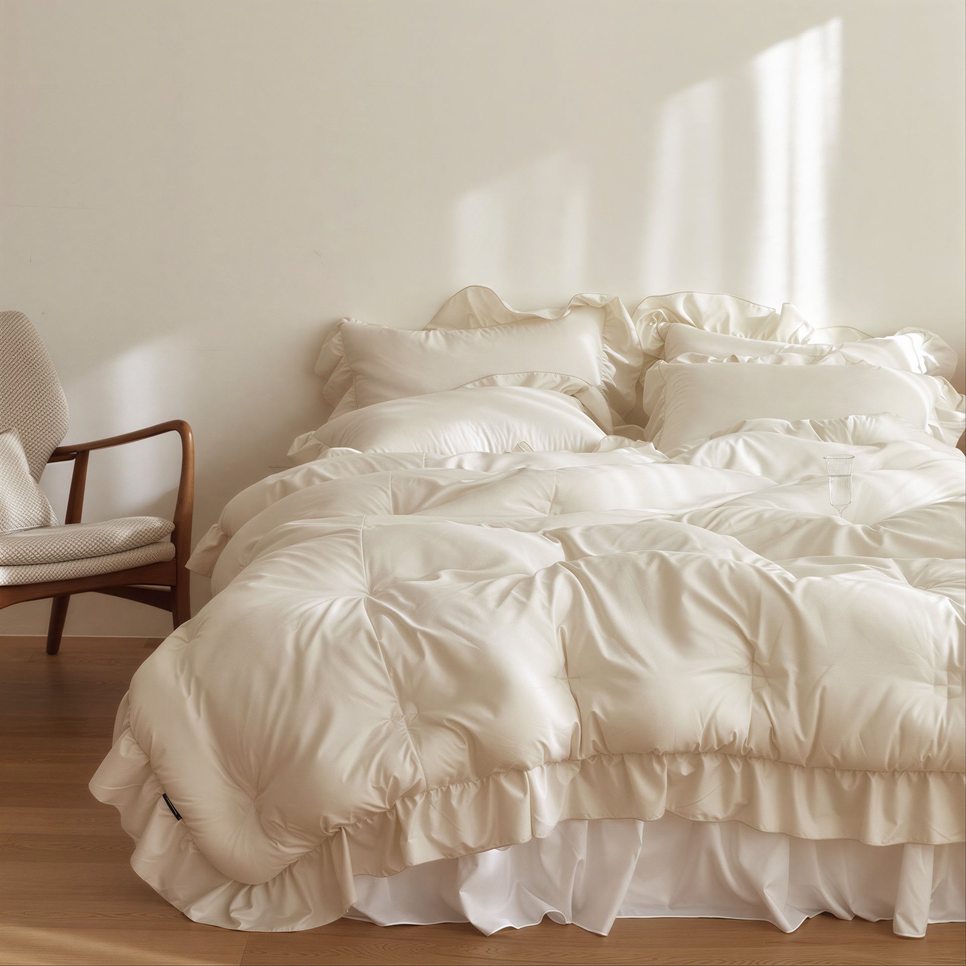 A soft, hotel-inspired comforter designed with dust-free microfiber fabric and clean antibacterial filling. Its lightweight structure keeps it fluffy while maintaining a balanced sleeping temperature throughout the night. Finished with a subtle frill edge and smooth texture, it adds a relaxed yet polished touch to any bedroom.