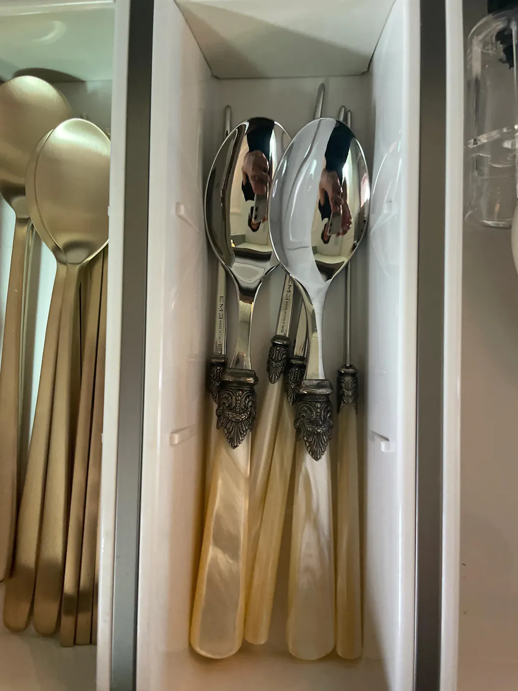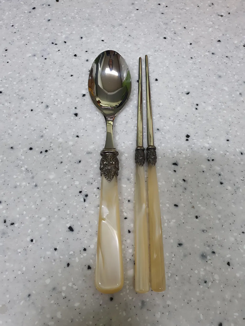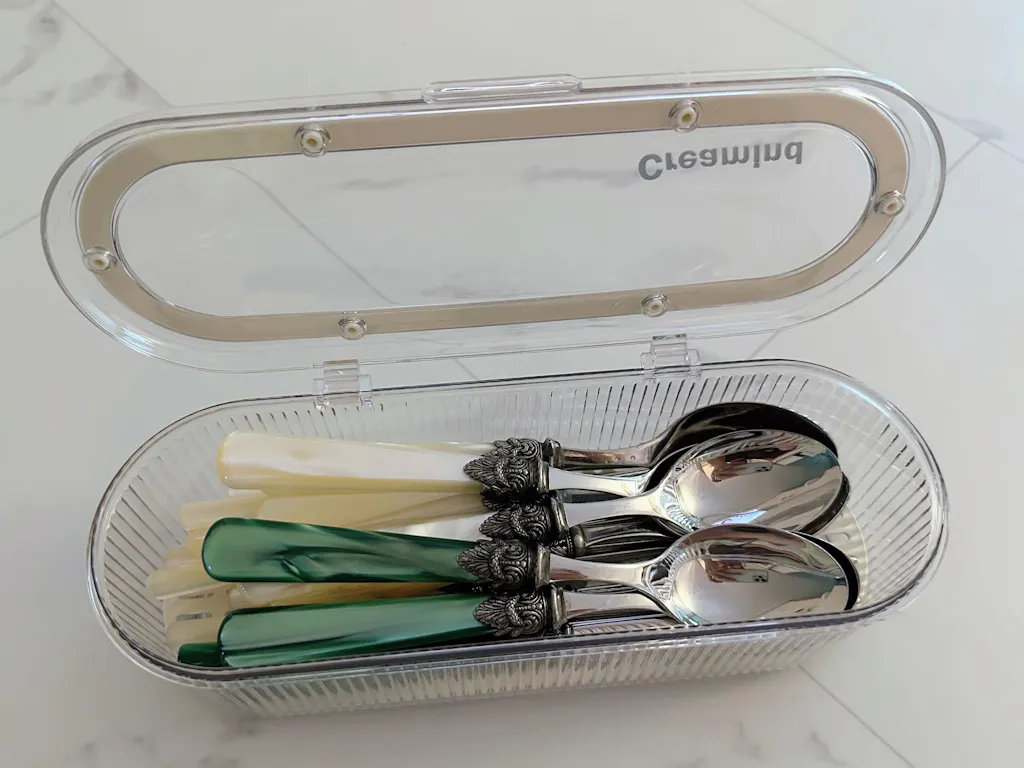 A 2-person Korean cutlery set with a classic Napoleon-style decorative detail at the neck and a translucent acrylic handle. The design draws from the Empire Style of early 19th-century France, giving it a refined look that still feels right on a modern table. The tin/pewter joint at the neck resists rust and color change for lasting daily use. Made in Italy.