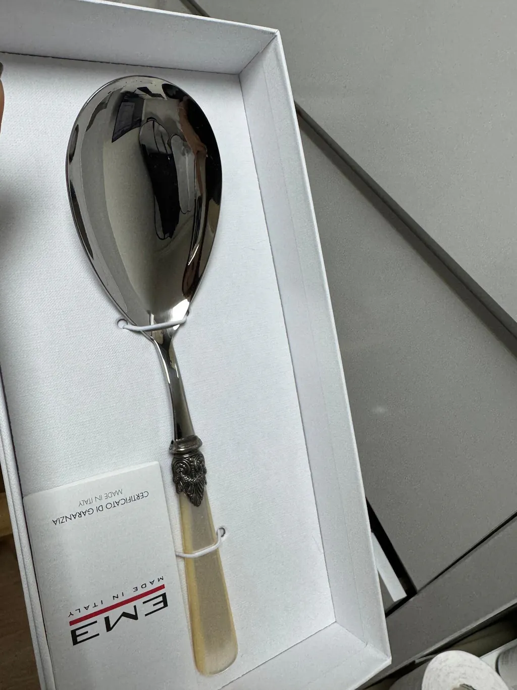The EME Napoleon Rice Server is handcrafted in Italy from premium 18/10 stainless steel with a brilliant mirror finish and an ivory acrylic handle accented by ornate metal detailing. Inspired by the elegance of the Napoleonic era, this piece blends European luxury with everyday functionality. Durable, scratch-resistant, and beautifully balanced in hand, it makes a standout gift for weddings, anniversaries, and sophisticated homes.