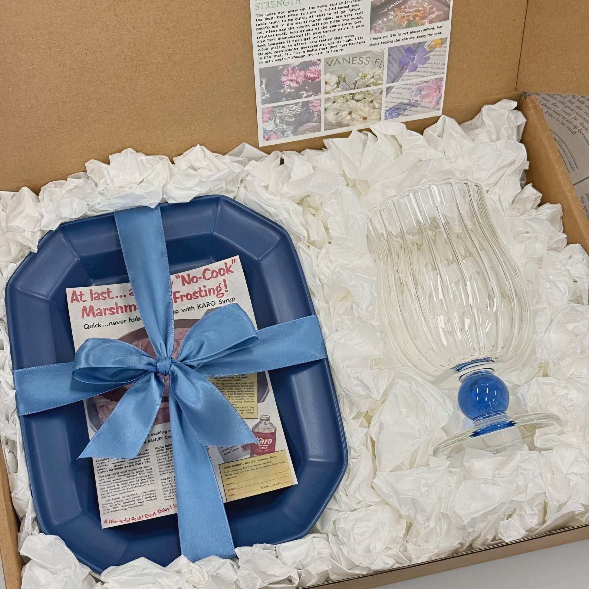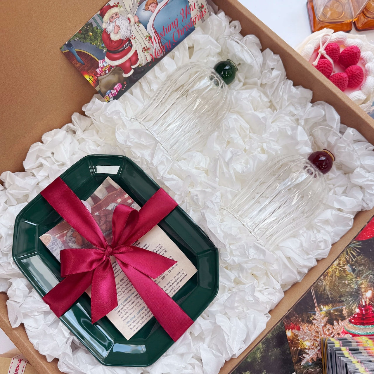 This gift box includes two handcrafted tulip-shaped wine glasses and one vintage-inspired ceramic plate.
