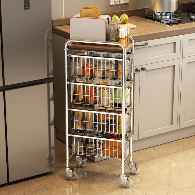 This slim rolling basket trolley is built to maximize storage in tight spaces without sacrificing durability or style. Built with a sturdy stainless steel frame and topped with a warm solid wood shelf, it slides easily between cabinets, refrigerators, or counters to turn unused gaps into practical storage.