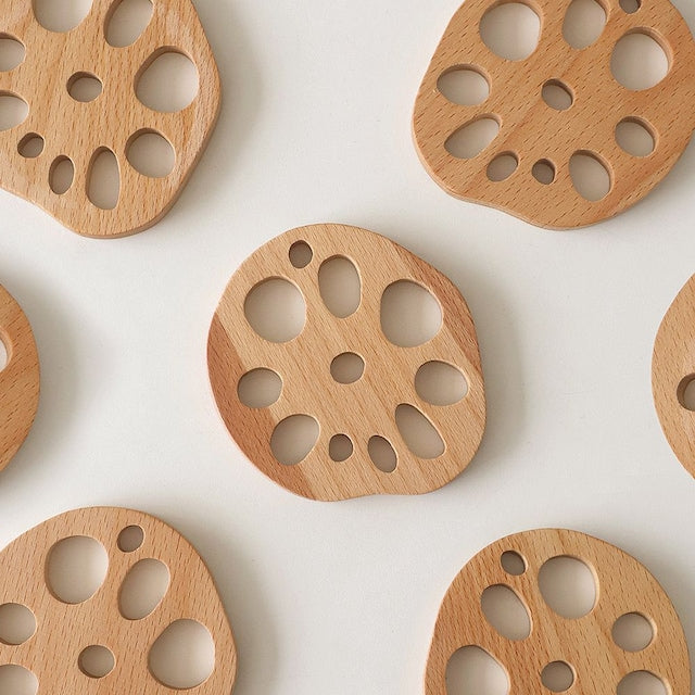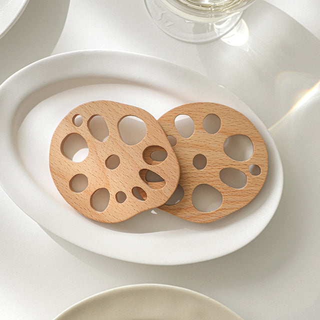 This wood lotus root spoon rest set gives your utensils a place to rest between bites, with a generous round surface that makes it easy to set down spoons, chopsticks, or small cutlery without fussing over placement. The natural wood finish brings warmth to any table setup, and each piece can double as a small coaster.